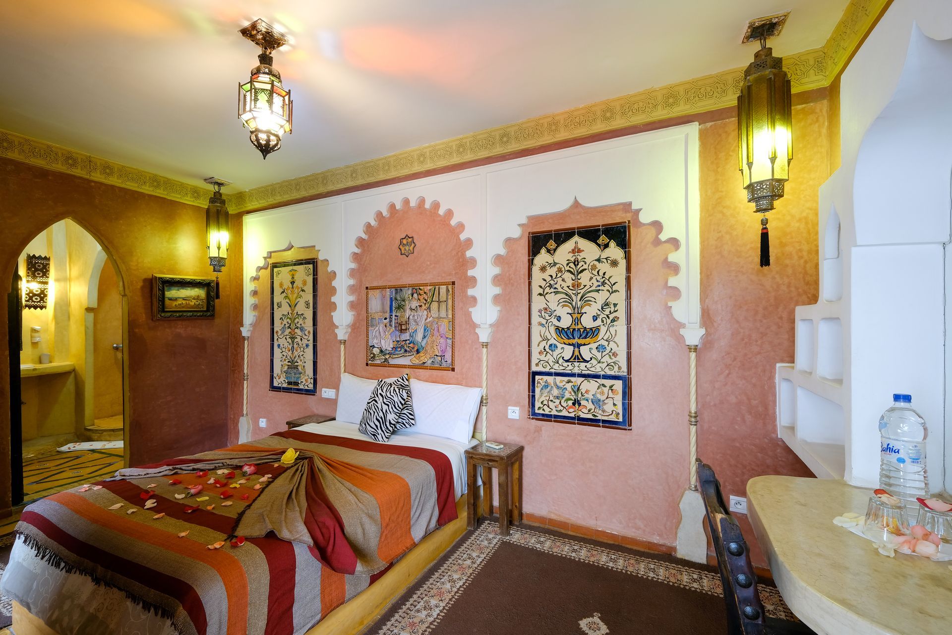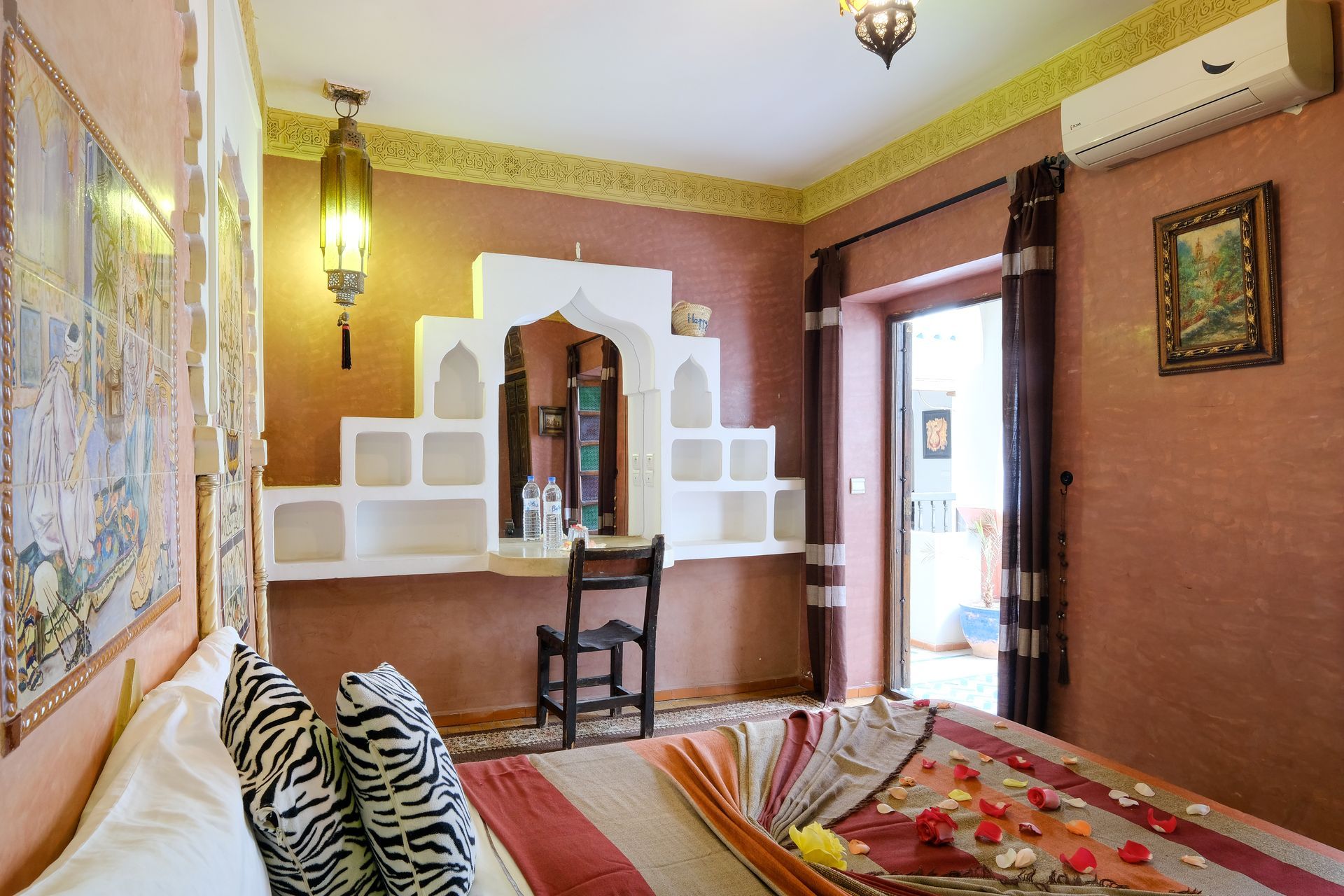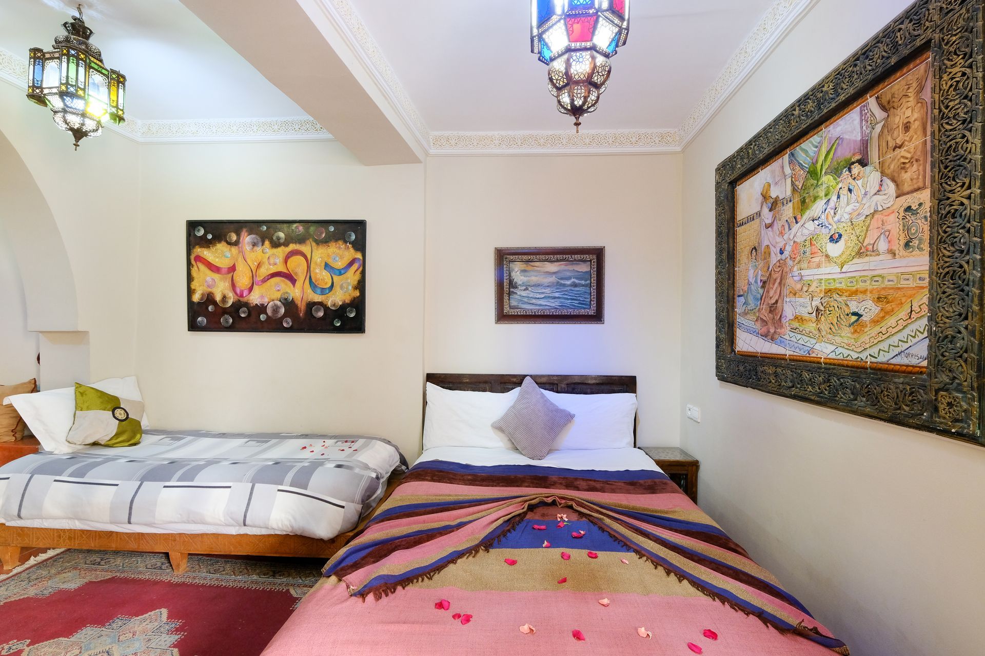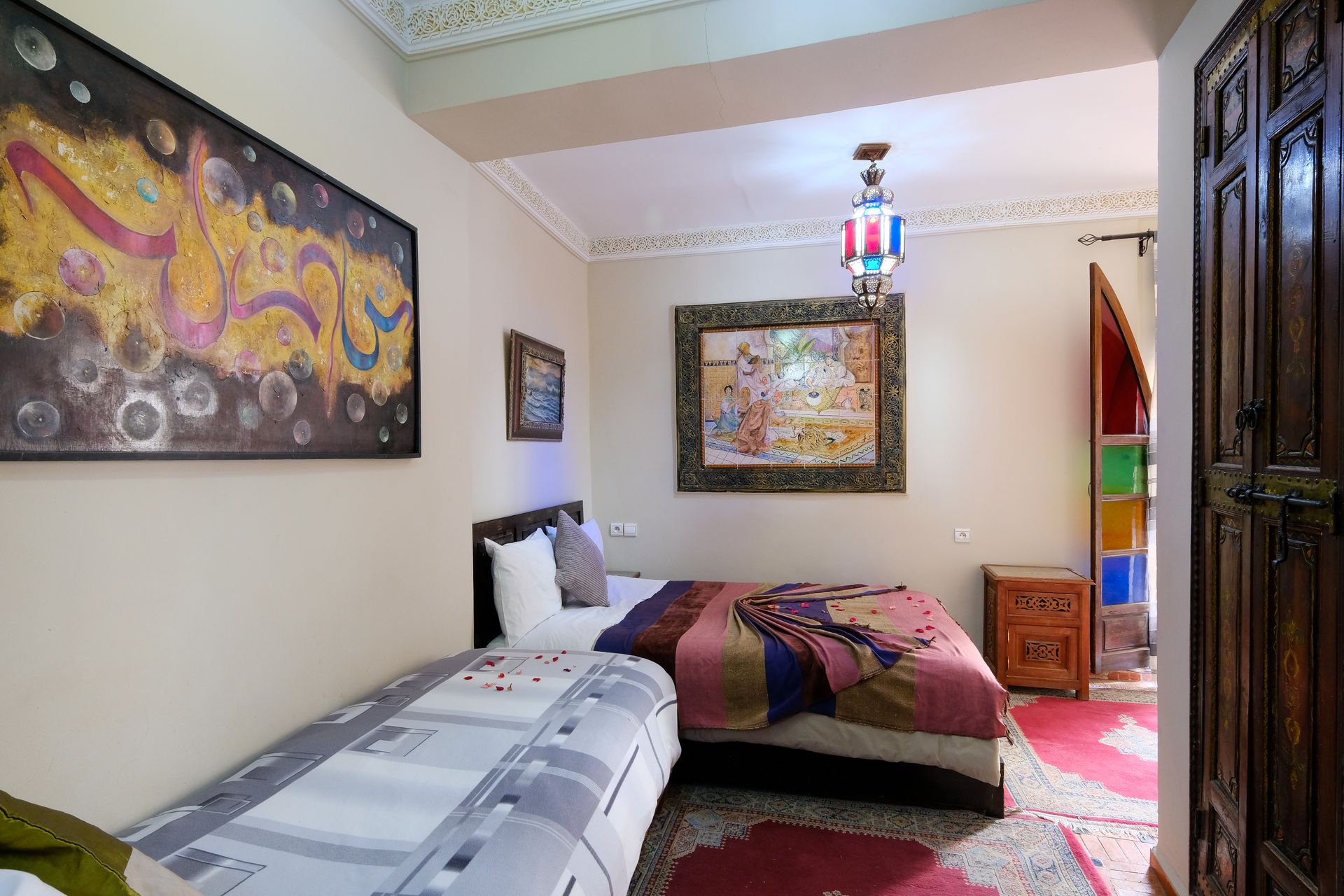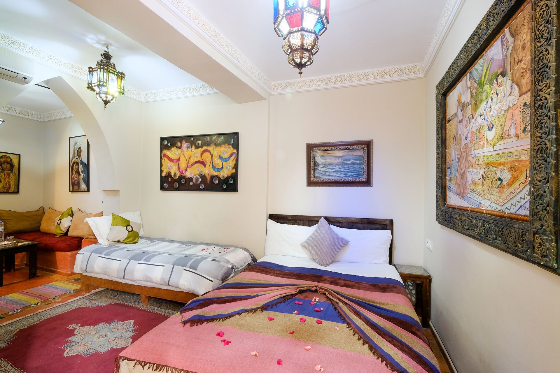 Cuenta con un gran armario para tu comodidad y ofrece una distribución flexible: 1 cama doble y 2 individuales, o 4 camas individuales según tus necesidades. Una opción perfecta para descansar tras explorar la magia de Marrakech.